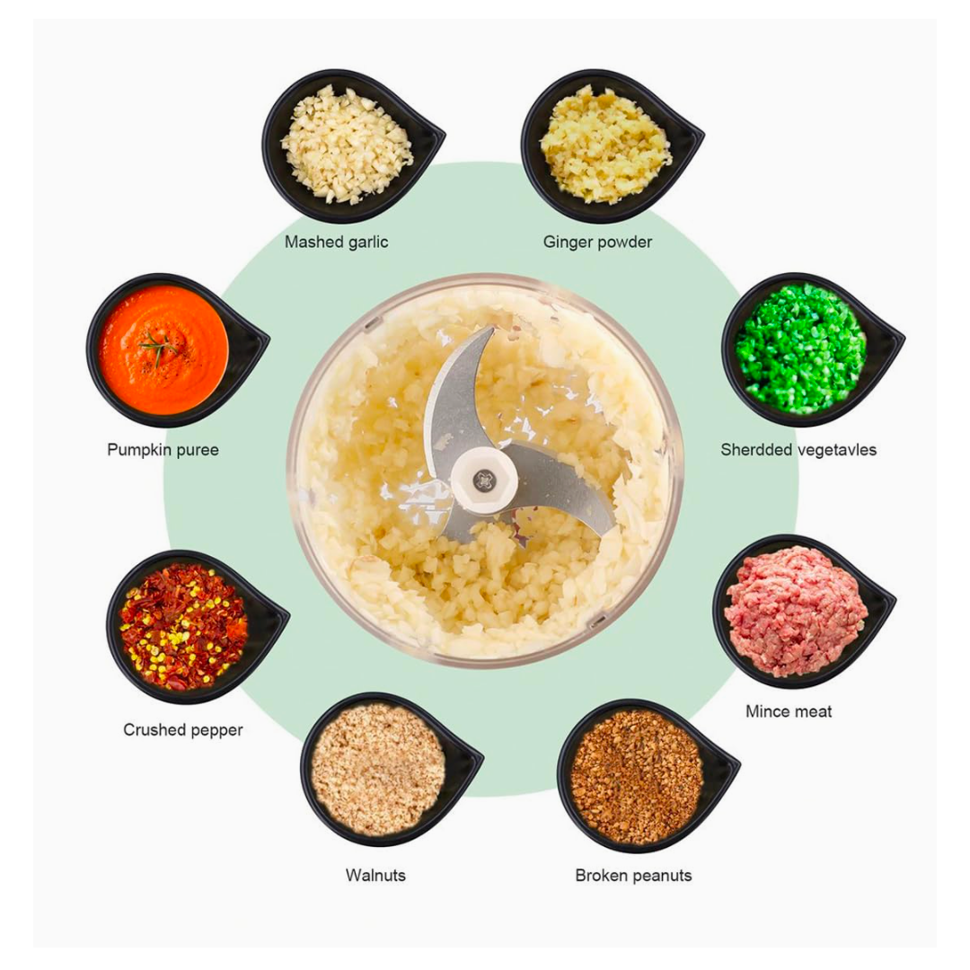 Why Choose our electric mini food chopper Mini electric food processor Meet the small amount of side dishes demand without waste Chopping made simply with one-button operation Chopped the food so quickly, speeds up your prep time Removable parts, easy to clean up Wireless design is so convenient for carrying, use it while camping, barbecuing or anywhere you need you can take it to anywhere you want.